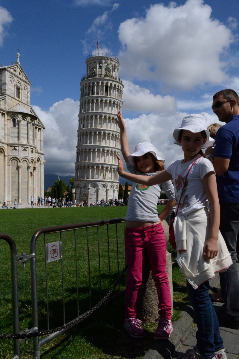It’s all in the angle! They’re doing what everyone does when they come to see the Leaning Tower of Pisa – getting the elusive “Yes, it really DOES look like I’m holding it up” shot. All over the Campo dei Miracoli they’re doing it…with their hands; laying on the grass and “holding” the tower up with their feet; or pretending to hug or kiss it, which looks weird from any angle.