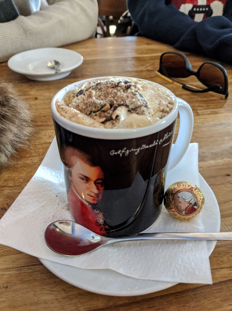 When we travel we generally only eat one meal a day out. Breakfast is at home, dinner is often at home, especially as the nights roll in at about 5pm in a European winter. While I prefer my coffee short and black I tried a Mozart coffee…double shot, with choc liqueur and cream on top. Not really my taste, but boy was I buzzing!