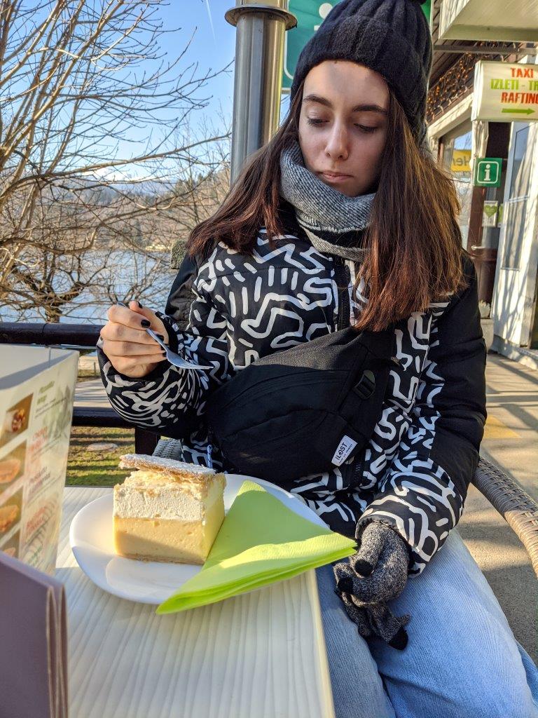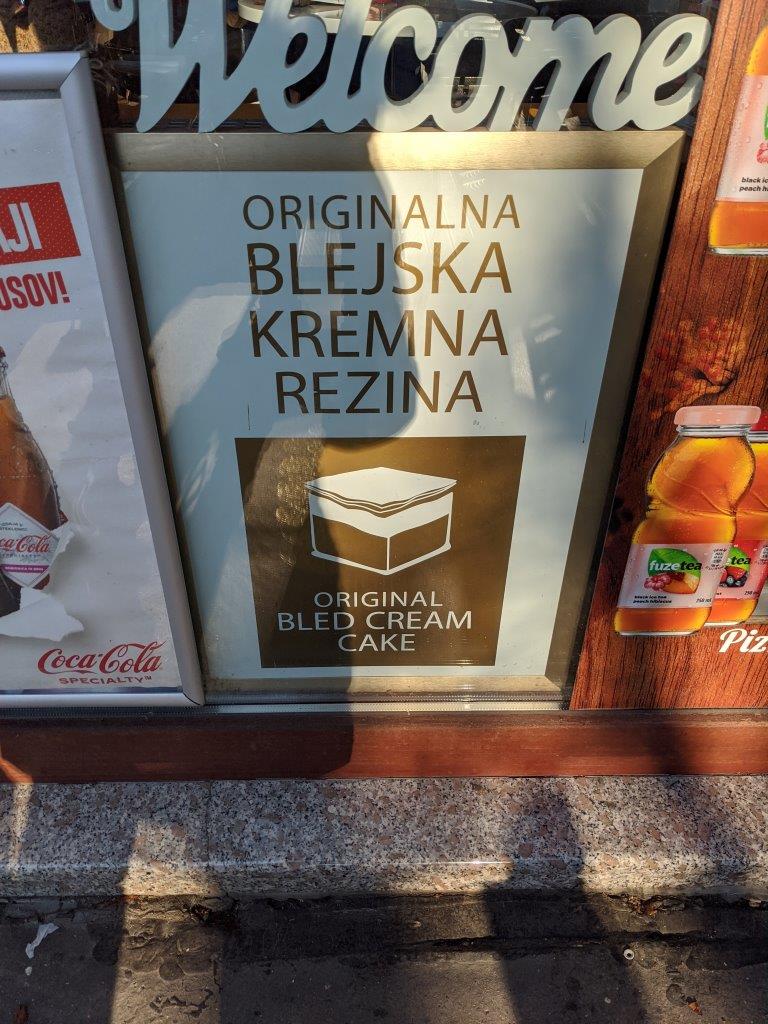 I have been hanging out for this Lake Bled trip for the jaw dropping scenery obviously, but also to sample the much-written-about “kremsnita”, or Bled Cream Cake. It’s been served here since 1953 after pastry chef Istvan Lukacevic came up with his secret recipe at Bled’s Hotel Park. Various cafes and restaurants around town displaying the “Original Bled Cream Cake” sign sell them, and when we ordered 2 slices, the cafe owner called through and they were fetched fresh from the bakery and brought to our table!