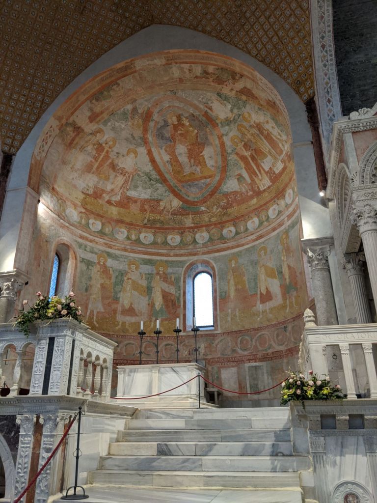 The Crypt of Frescoes beneath the church is home to some of those glorious washed out 12th century frescoes I love, as well as some bedazzled reliquaries holding a variety of saints’ bones. Fancy!