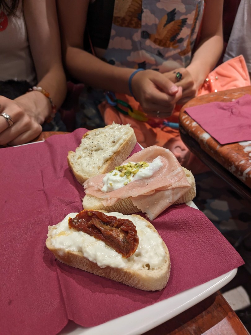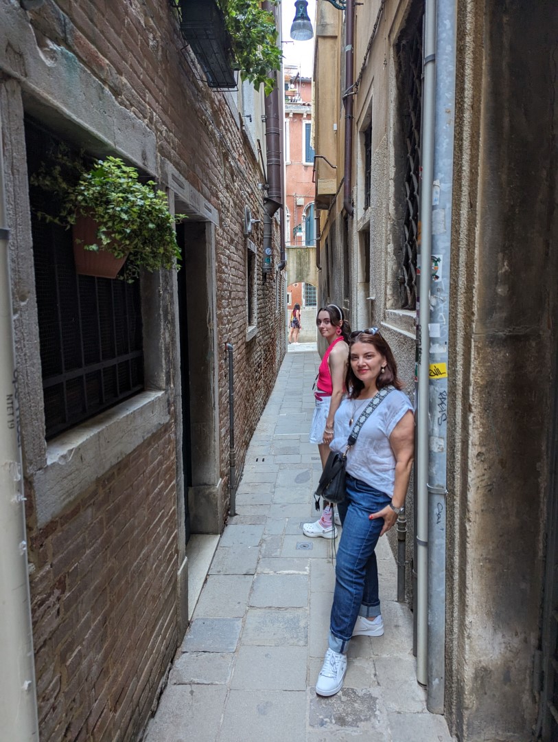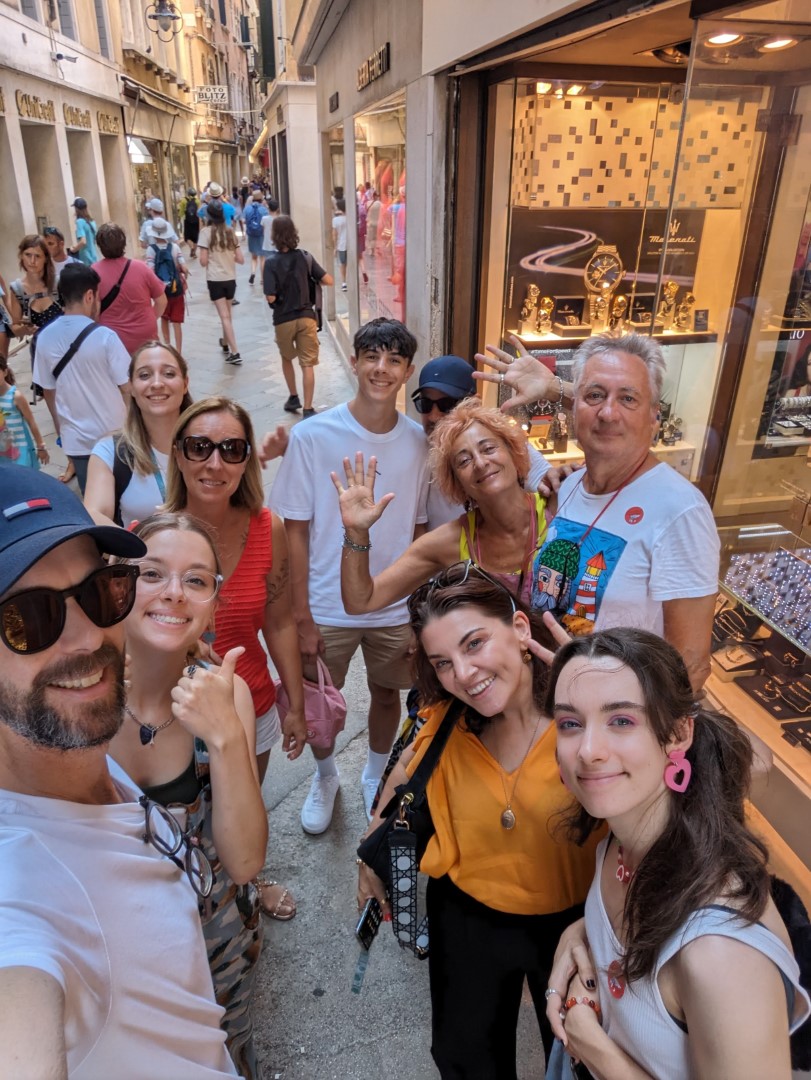 After our tour, we gathered at a Venetian bacaro, a wine bar that serves aperitives and “cicchetti”, Venetian finger food. Matteo at “Bacaro Da Me Pare” delivered platters of mortadella, prosciutto, baccala mantecata (cod paste), polenta, sarde in saor, slices of bread with stracciatella cheese and anchovy. With a tasty snack in one hand, and a spritz (with a base of Aperol, Campari, or the Venetian original, Select) in the other, it was wonderful to spend time catching up with the cugini.