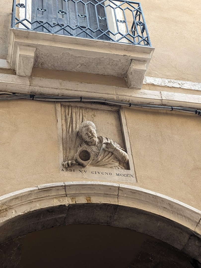 Aurora also pointed out a statue of a woman with a mortar that looks down from behind the Torre dell’Orologio, above the arch of the Sottoportego del Cappello Nero. On June 15, 1310, the ducal throne was to be overthrown by a band of revolutionaries, who were set to storm St. Mark’s squar, until commoner Giustina Rossi threw her mortar out her window and bopped one of the key conspirator’s on the scone, killing him. Her great, great, great (x 10) grandkids were happy with the outcome. Rent on her property , FIVE STEPS TO ONE OF THE MOST FAMOUS SQUARES ON THE PLANET, was fixed for all her descendants as a sign of the Doge’s gratitude for thwarting the revolt.