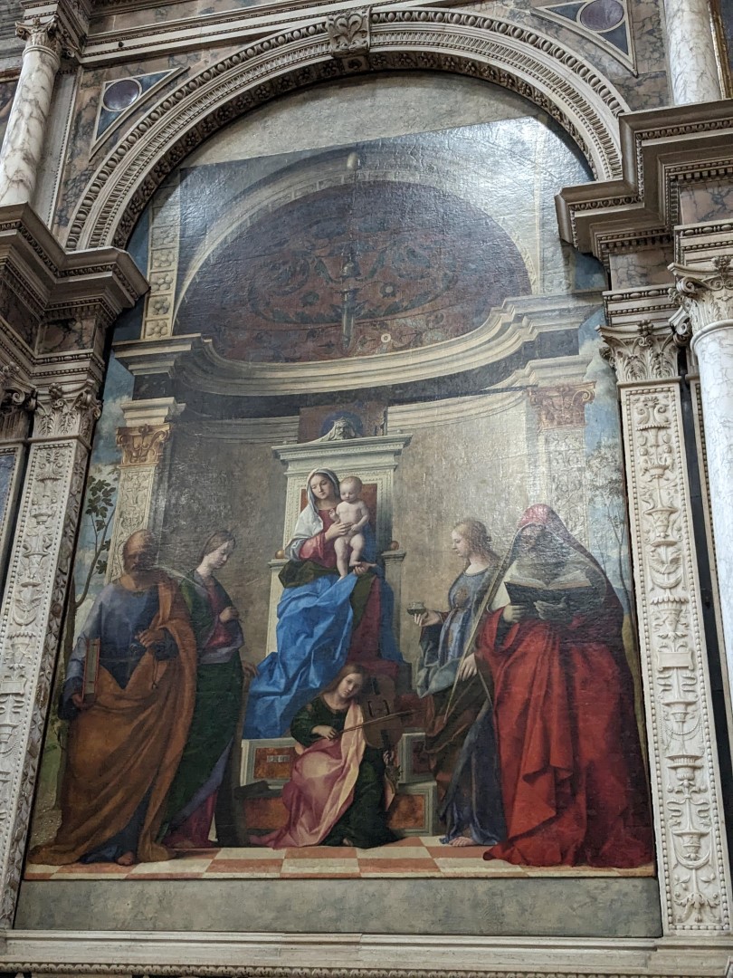 One church near our apartment in Castello (the largest of six “sestieri” or areas of Venice) that we were keen to check out was San Zaccaria. Built in the 9th century and then reworked and fancied up in the mid 1400’s, the inside is its own gallery; a riot of colourful artwork by various Renaisssance painters covering every wall. I had the chance to see another Bellini work, “Madonna and Child with Saints” from 1505. His intricate details, facial expressions, and bold colours are divine.