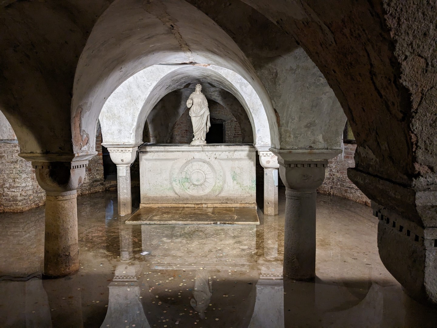 Enter a little museum to the right of the church (we were the only ones who seemed to know this was a thing as the place was deserted), and you’ll find more lush artwork, some currently being repaired, by Antonio Vivarini. The highlight lays beneath this, where a flooded crypt, below Venice’s water level, houses the relics of eight doges. Probably not the best idea to build a basement in Venice t.b.h., but the water-filled crypt gives the space a mysterious mirror-pool effect, and glistens with coin offerings.