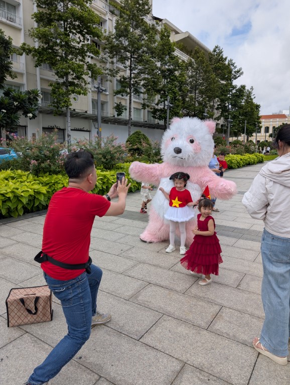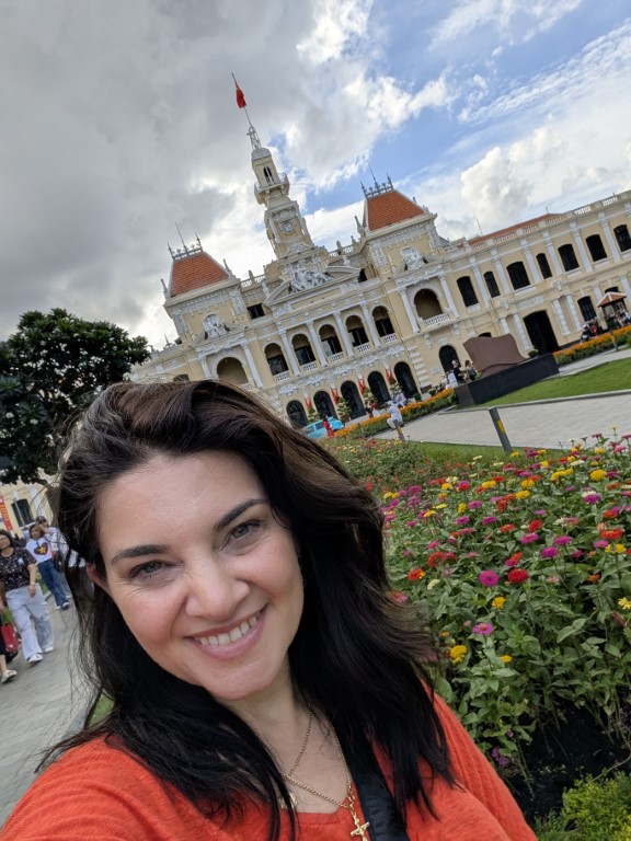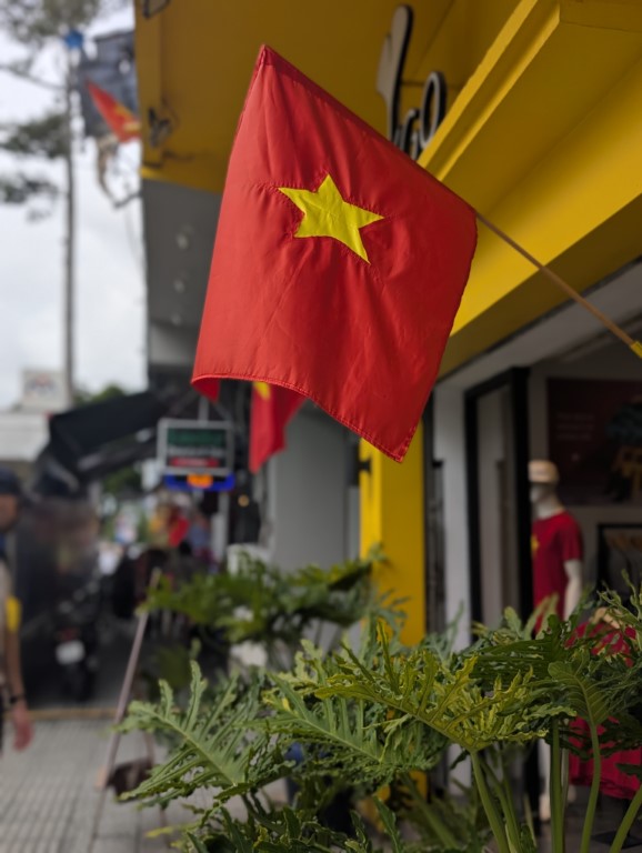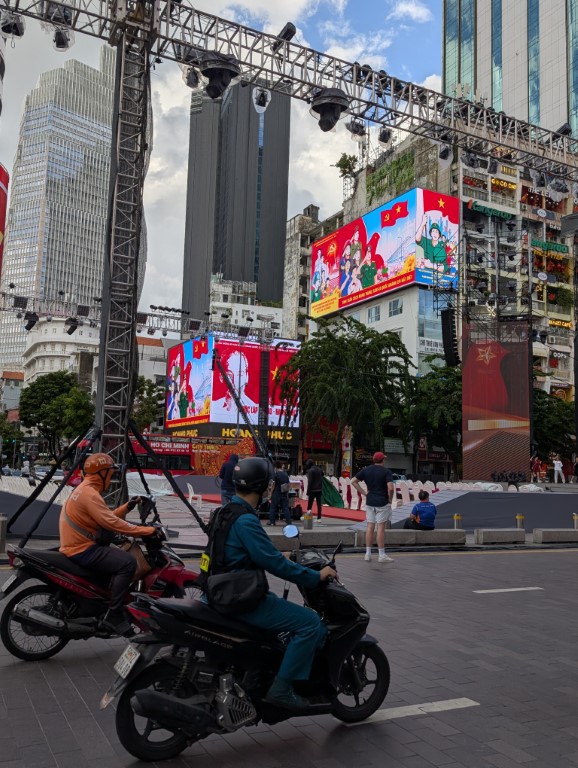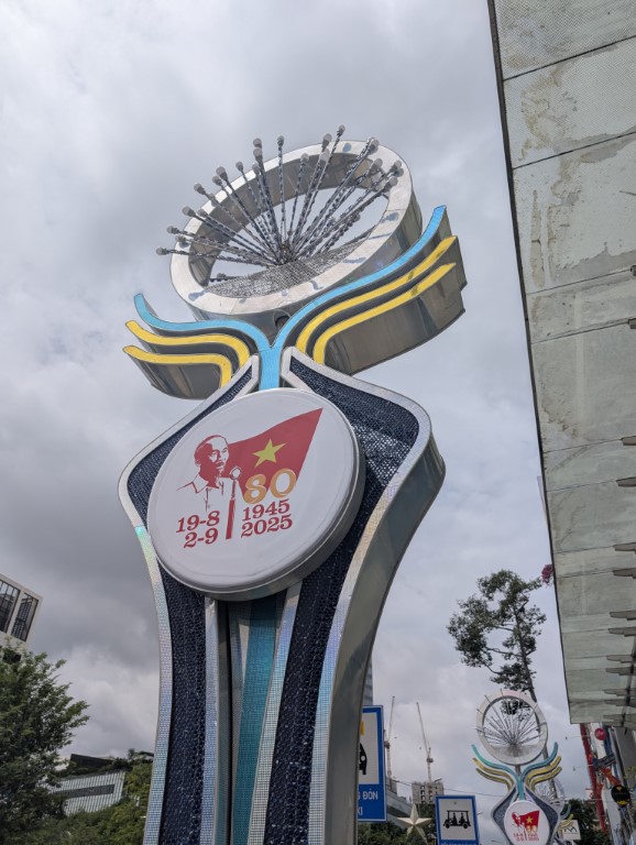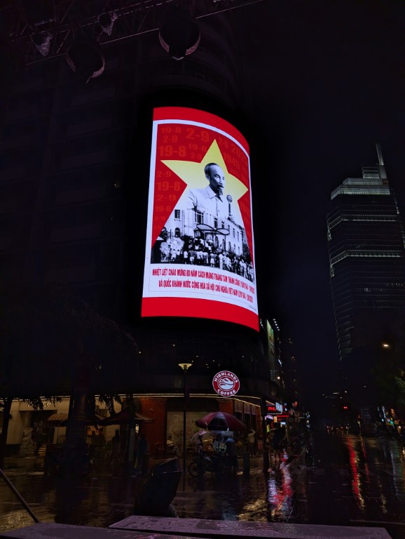 We arrived in Ho Chi Minh city to start our three-week Vietnam adventure bang in the middle of a four-day celebration of their 80th year of their declaration of independence from French colonial rule. Ho Chi Minh, Vietnam’s revered leader, proclaimed the country’s independence on September 2, 1945, and effigies built in his memory as well as enormous neon billboards of his face shone across the city that bears his name throughout the celebratory holiday break. Proud Vietnamese citizens were dressed in traditional “ao dai” (long elegant dresses with pants underneath), wearing red t-shirts emblazoned with the country’s yellow star, or enthusiastically waving flags in celebration.