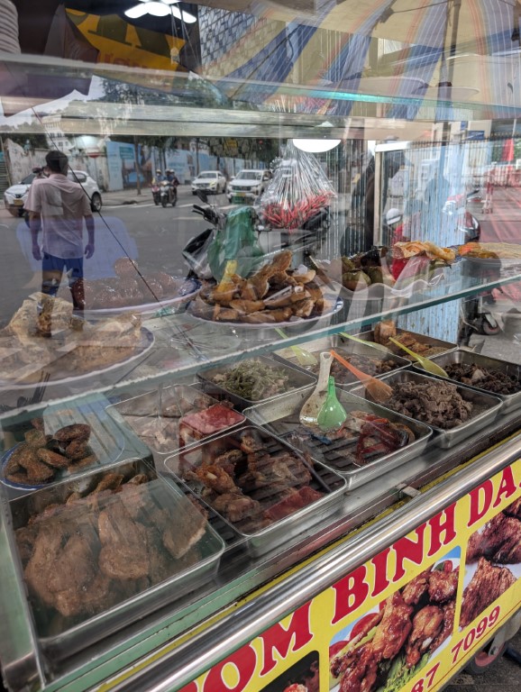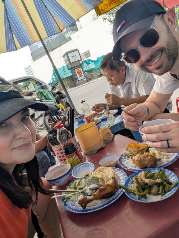 Hunched over a plastic table on 30 cm high stools we munched on a delicious fresh meal with cab drivers and local workers on the corner of Pasteur and Huynh Thuc Khang. Omelette, chicken, vegetables and rice. The guy next to us crushed ten birdseye chillies into his bowl of sauce and poured it over his meal. He sure likes it spicy.