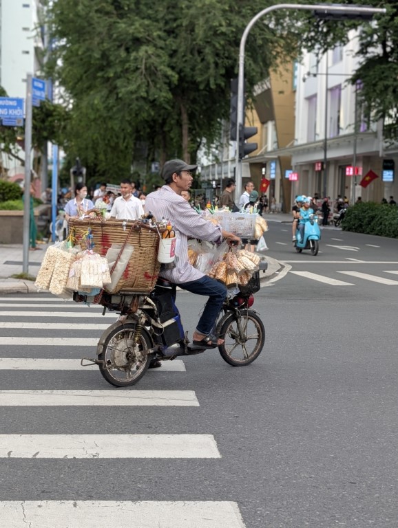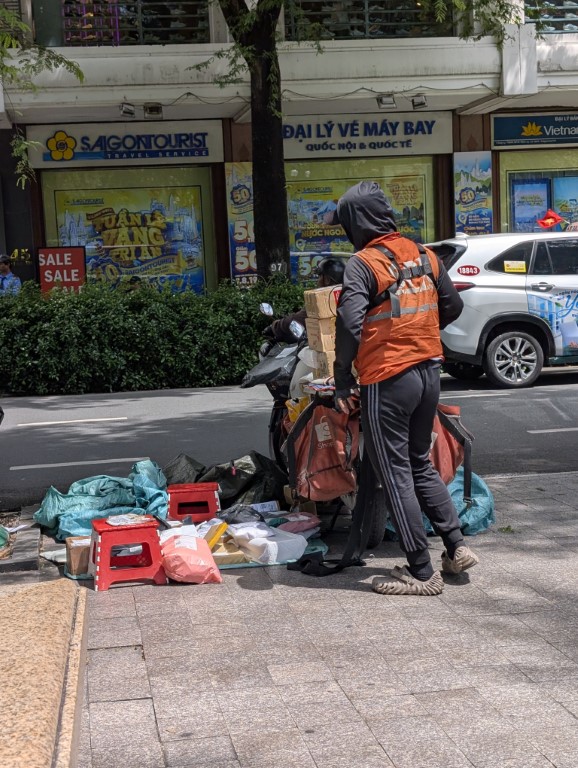 Our main aims in Ho Chi Minh were to taste as many things as we could, and check out as many shopping areas as we could, while sussing out how people navigated their world at the same time. The constant movement and micro stories that unfold at every corner is overwhelming, thrilling, and exasperating. People selling bags of food pinned to fences. People with bamboo poles balanced across their shoulders selling coconuts filled with fresh milk. Hoards of people waiting to collect their post from an un-uniformed guy managing a pile of deliveries on a tarp on the footpath. People sleeping balanced on their motorbike, flip flops hanging from their toes. Cobblers and bike-repair experts waiting for their next customer on the broken pavement. People, people, everywhere wearing head to toe fleece in 32-degree heat, as we sweltered in linen shorts and tees.