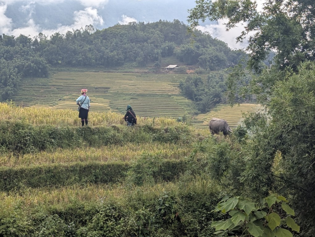 Another Black Hmong woman, Jewel, walked with us for part of the journey. As I slipped awkwardly over muddy paths beaten down by water buffalo and tentatively crossed over wild flowing rivers, she navigated without pause, in her 60s, carrying two long bamboo staffs, and wearing gum boots.