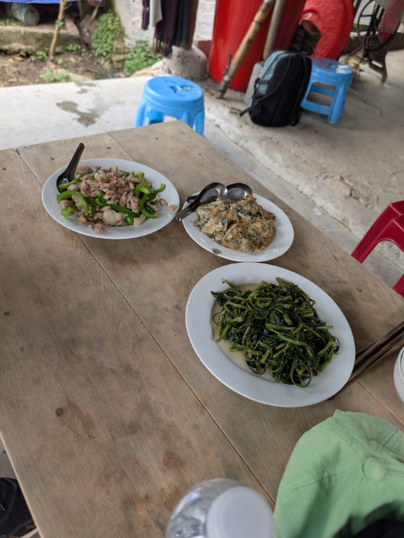 We ate a delicious lunch of pork, morning glory (a green leafy vegetable very popular everywhere we went) and rice in the home of one of the local villagers. The children of families working the rice fields played together with planks of wood and rocks, while ducklings, cats and dogs scurried around them. Dried corn hung from roofs ready to feed the animals next season.
