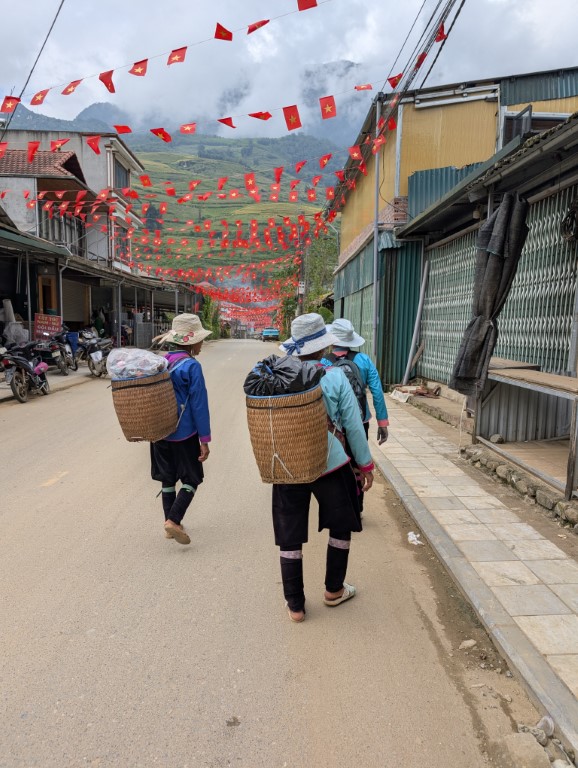 There are many local Hmong tribes in the area, and each of them can be identified by their traditional clothes. Yim wore black velvet shorts and had her calves wrapped in black velvet fabric decorated with colourful ribbon for mosquito and sun protection. The women also wear multiple large silver hoop earrings, colourful long-sleeved shirts, and carry cane baskets on their backs filled with their handwoven textiles and toys to sell.