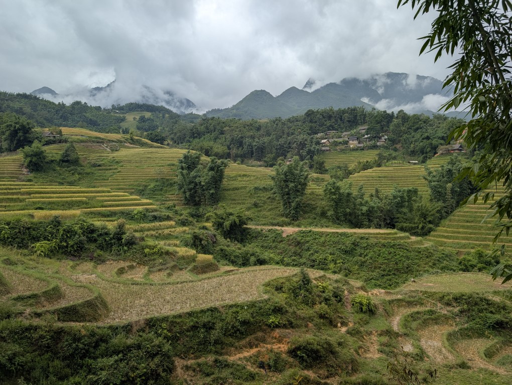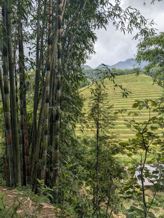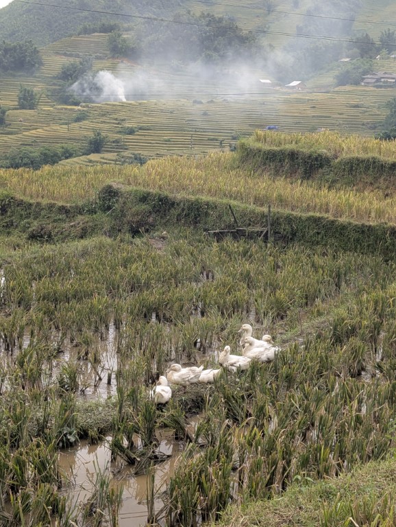 The 6-hour trek was stunning. We saw tessellated rice paddies curving around mountains; water buffalo lazing in muddy puddles; dogs, laying in the dirt exasperated from the heat; chickens and their chicks, ducks and their ducklings foraging below bamboo forests and around homes; the sound of crickets and roosters echoing through the countryside; and the occasional motorbike piled with bags of rice, long runs of timber or children, winding through the small villages.