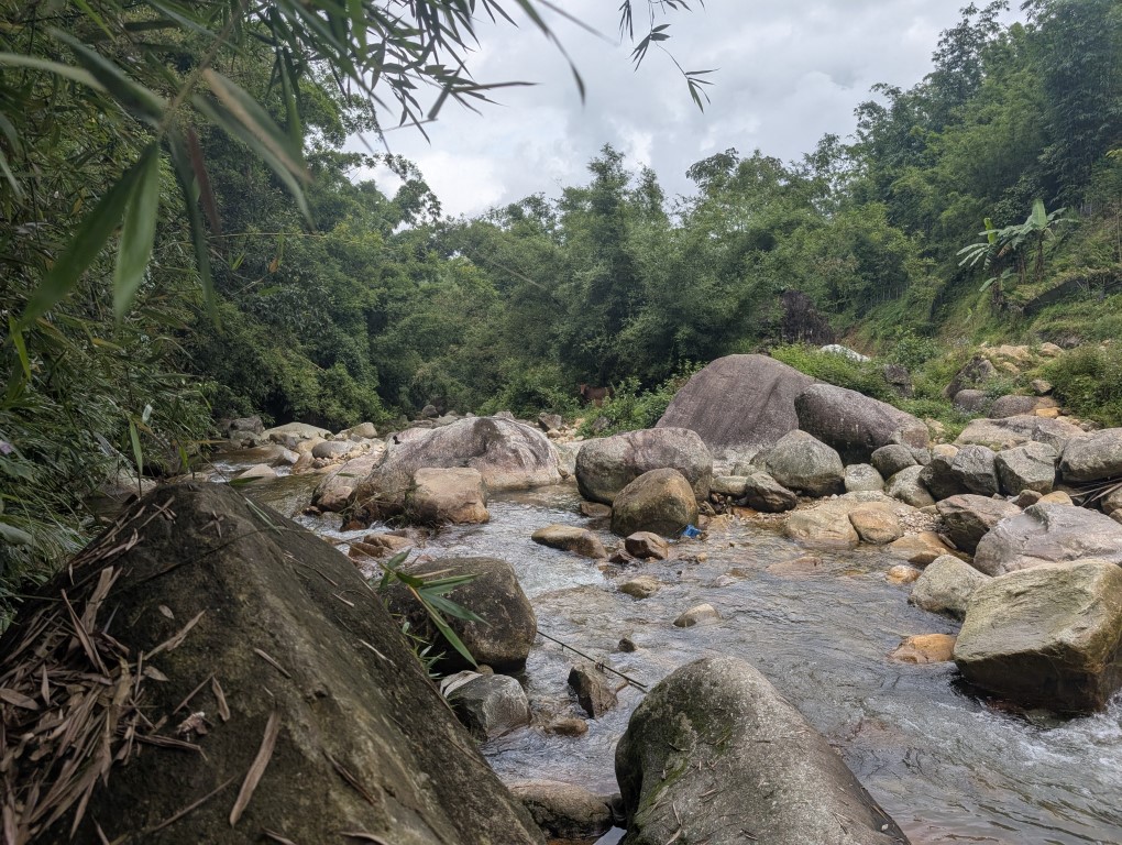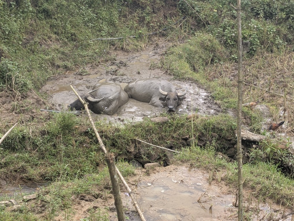 Another Black Hmong woman, Jewel, walked with us for part of the journey. As I slipped awkwardly over muddy paths beaten down by water buffalo and tentatively crossed over wild flowing rivers, she navigated without pause, in her 60s, carrying two long bamboo staffs, and wearing gum boots.