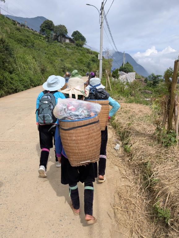 There are many local Hmong tribes in the area, and each of them can be identified by their traditional clothes. Yim wore black velvet shorts and had her calves wrapped in black velvet fabric decorated with colourful ribbon for mosquito and sun protection. The women also wear multiple large silver hoop earrings, colourful long-sleeved shirts, and carry cane baskets on their backs filled with their handwoven textiles and toys to sell.