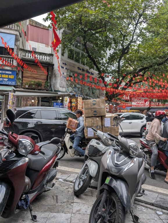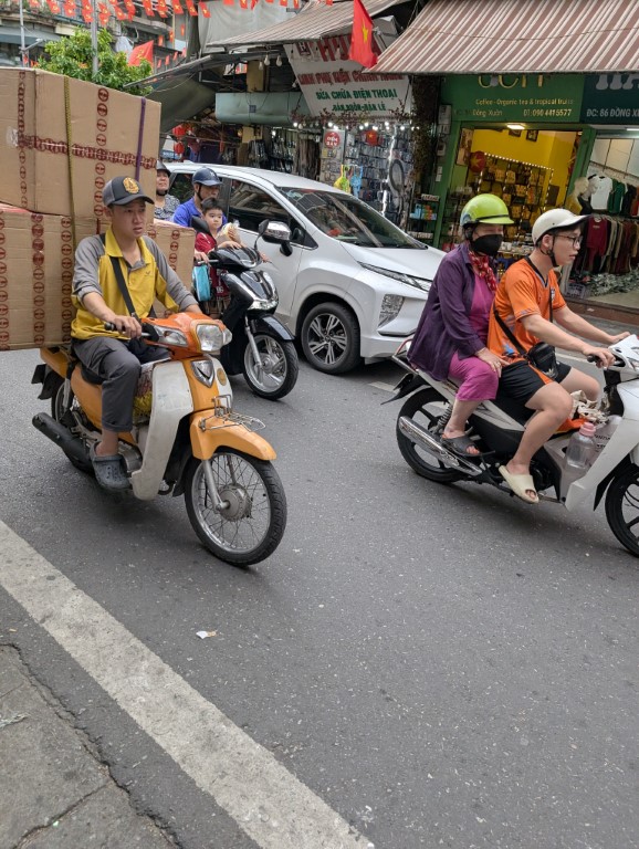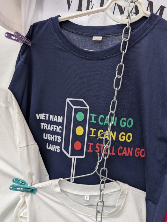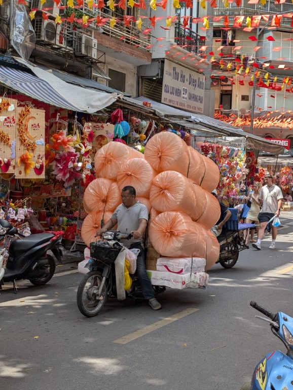 The Vietnam version reads: “Be relaxed and self-confident, pay attention to incoming drivers, keep your speed steadily, and NEVER WALK BACK.” Nobody stops for anyone. Traffic lights and rules are merely recommendations. Motorbikes and scooters are overloaded with people and cargo. We saw a guy riding with a newborn baby in one hand, mobile phone in the other. A guy with a pane of glass under one arm, smoke in the other hand. A guy with TWO WASHING MACHINES. One with eight water dispensers. Boxes and food and birdcages and dogs and bouquets of flowers and balloon displays all being moved around the congested city on motorbikes and scooters, and usually by someone also checking their Instagram.