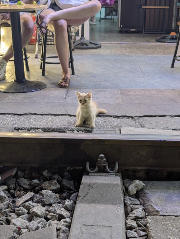 Then the craziness began. A guy wearing an unofficial polo shirt started blowing a whistle. He shouted at tourists that the train was coming. Locals and their kids kept casually crossing. The guy kept blowing his whistle, shouting and gesticulating, “Train. Train.” We could feel it before we could hear it. It rushed past us and we could have reached out to touch it. People laughed at the ridiculous danger of it all, but were also thrilled by the exhilaration of having a train shuttle past us. The cats did not care.